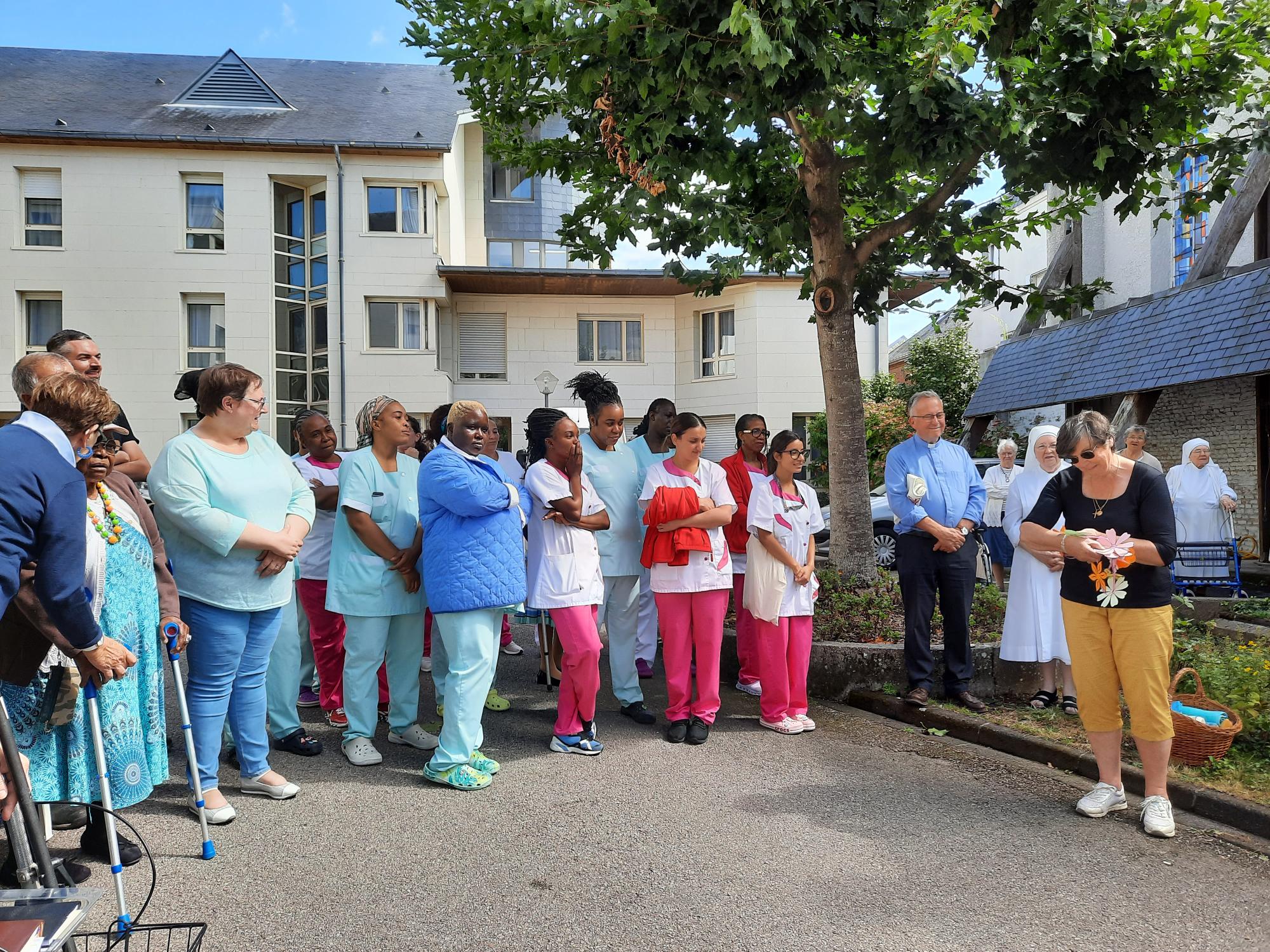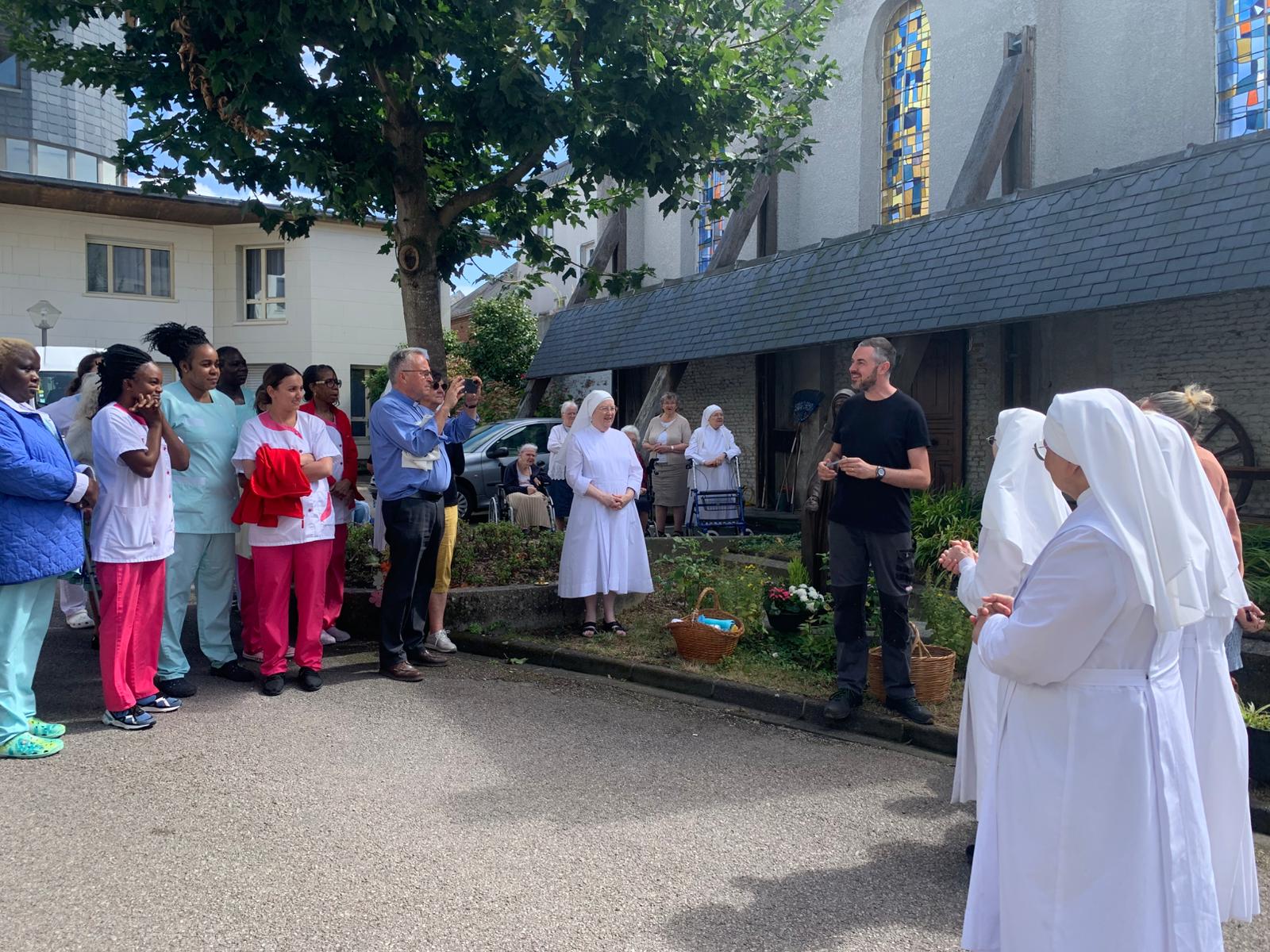 Chacun s’est avancé à son tour pour déposer son objet et donner son témoignage : aide-soignantes, infirmiers, personnel de ménage, lingerie, cuisine, animation, bénévoles, membres de l’AJJ, le père aumônier et les Petites Sœurs. Les paroles étaient simples, touchantes, et montraient combien chaque geste du quotidien est une source de joie pour les résidents.