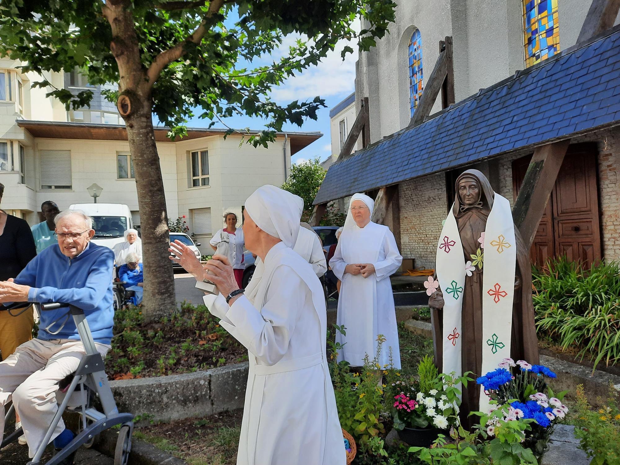 À l’occasion de la fête de Sainte Jeanne Jugan à Ma Maison du Havre, une rencontre a été organisée la veille dans le jardin, autour de sa statue. Le personnel, les bénévoles de l’Association Sainte Jeanne Jugan et les Petites Sœurs étaient invités à apporter un objet symbolique et à partager quelques mots en réponse à la question : « Comment, dans mon service, je rends heureuses les personnes âgées jour après jour ? »