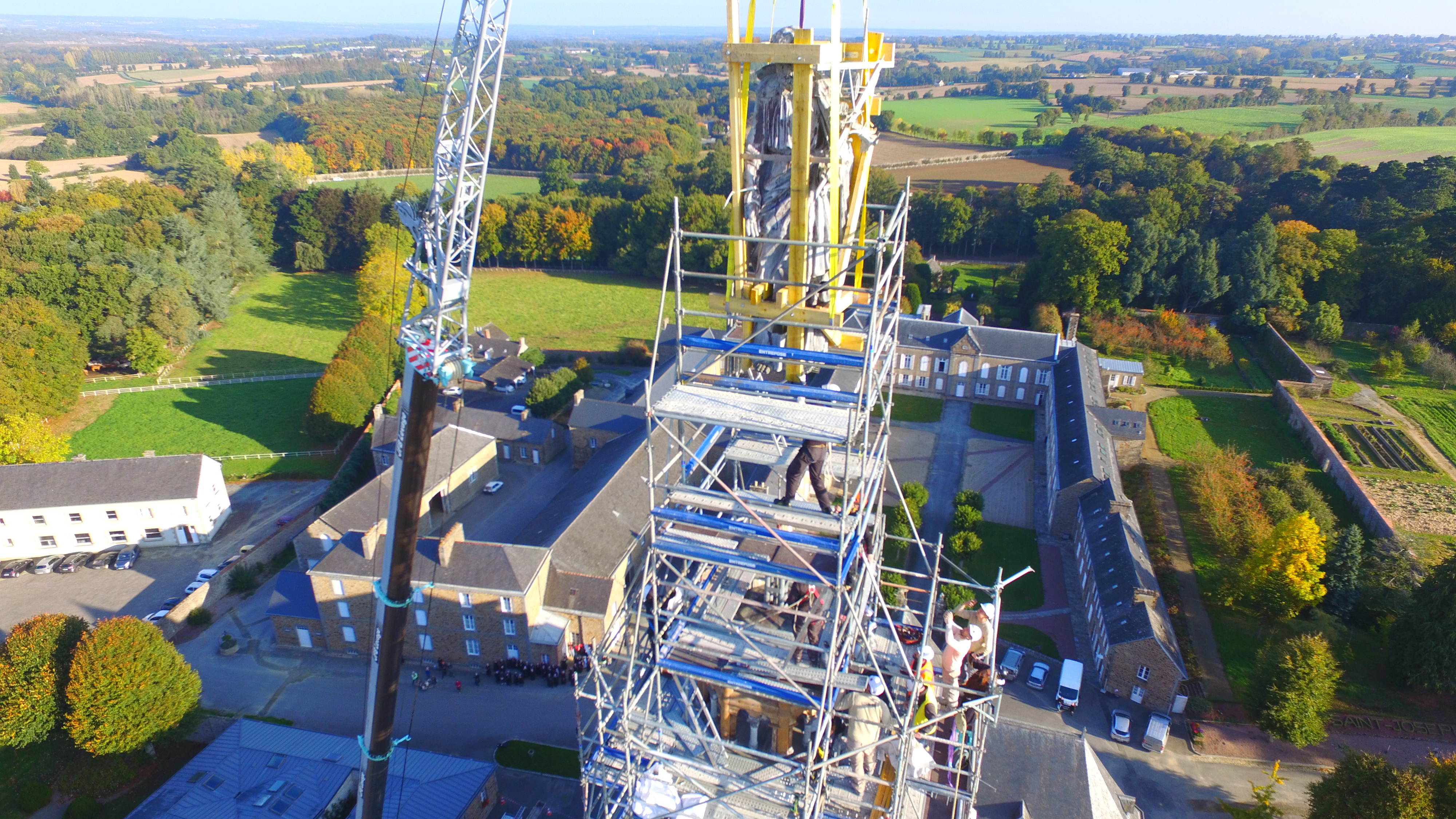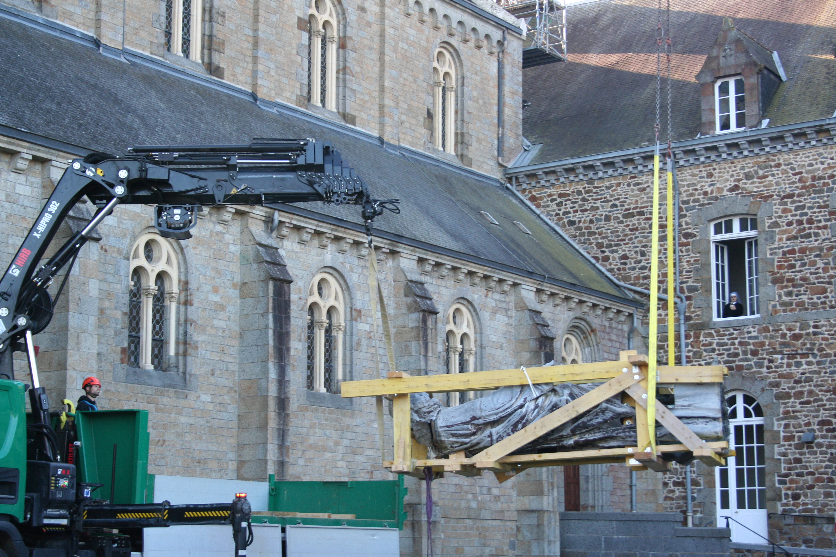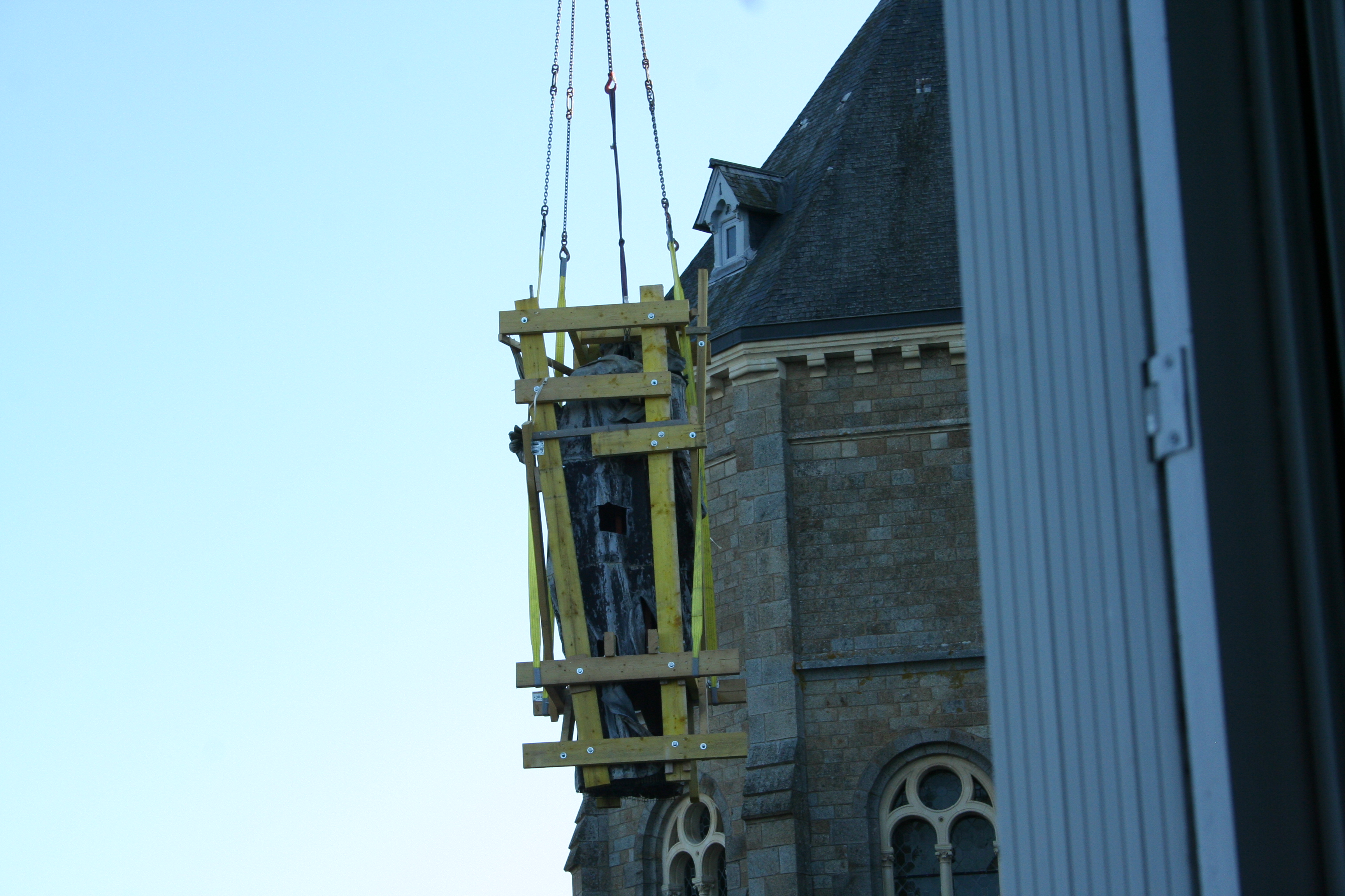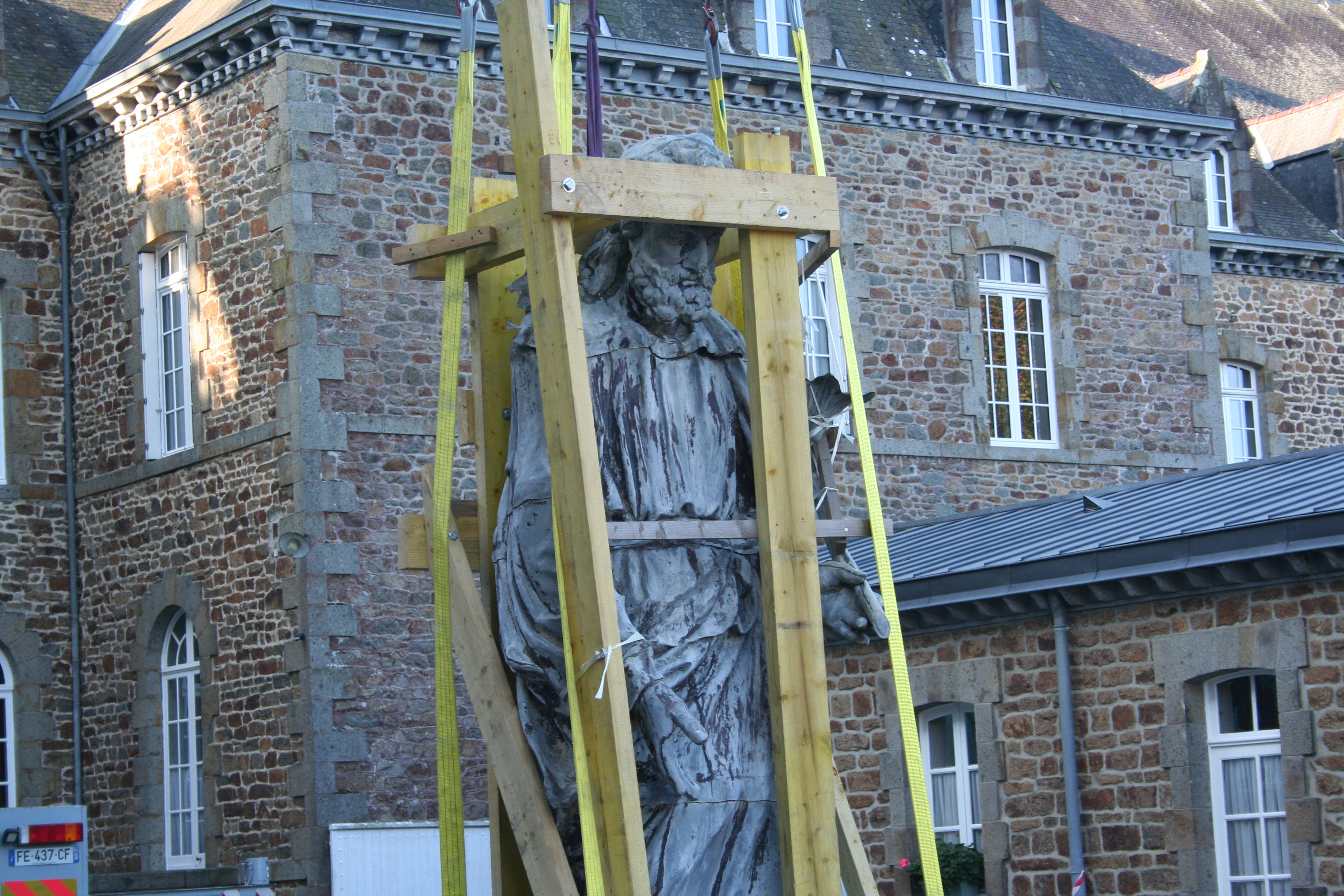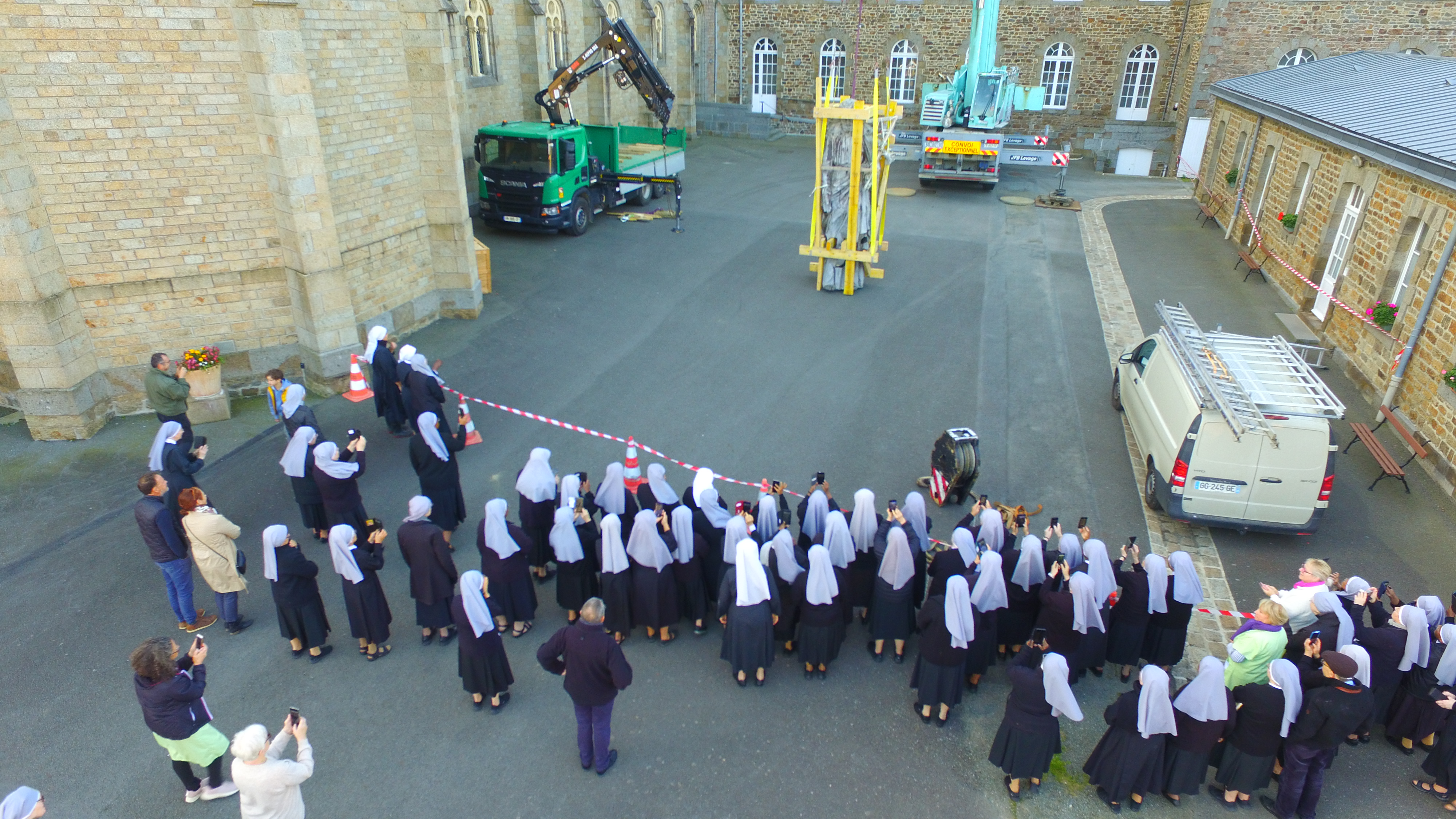 Ce matin, la statue de Saint Joseph, installée au sommet de la tour de la Maison Mère des Petites Sœurs des Pauvres à Saint-Pern, a été descendue à l’aide d’une grande grue. Les Petites Sœurs, les salariés et plusieurs habitants du quartier s’étaient donné rendez-vous pour assister à cette descente impressionnante. La statue est ensuite partie en direction d’Angers pour être restaurée.