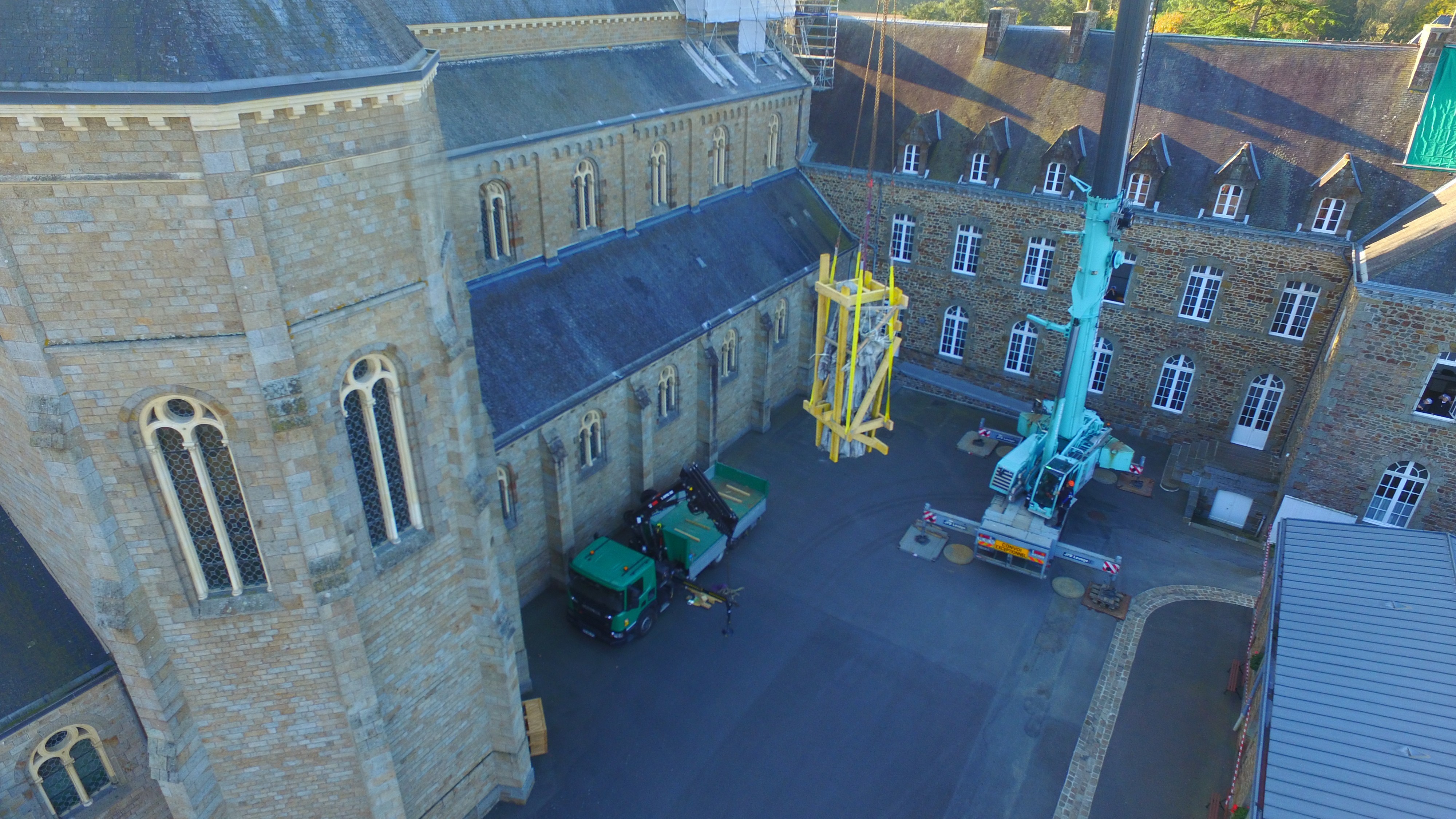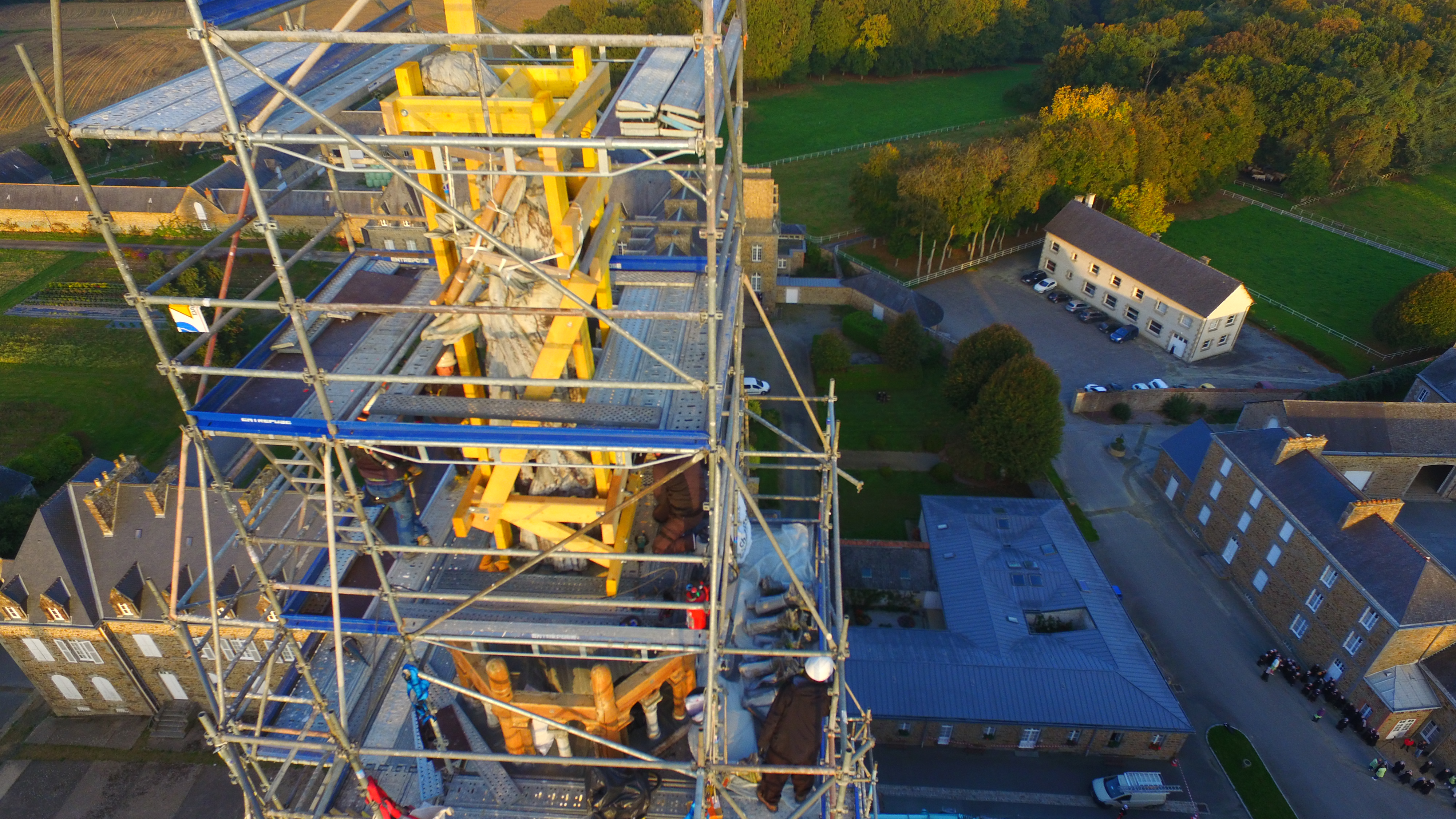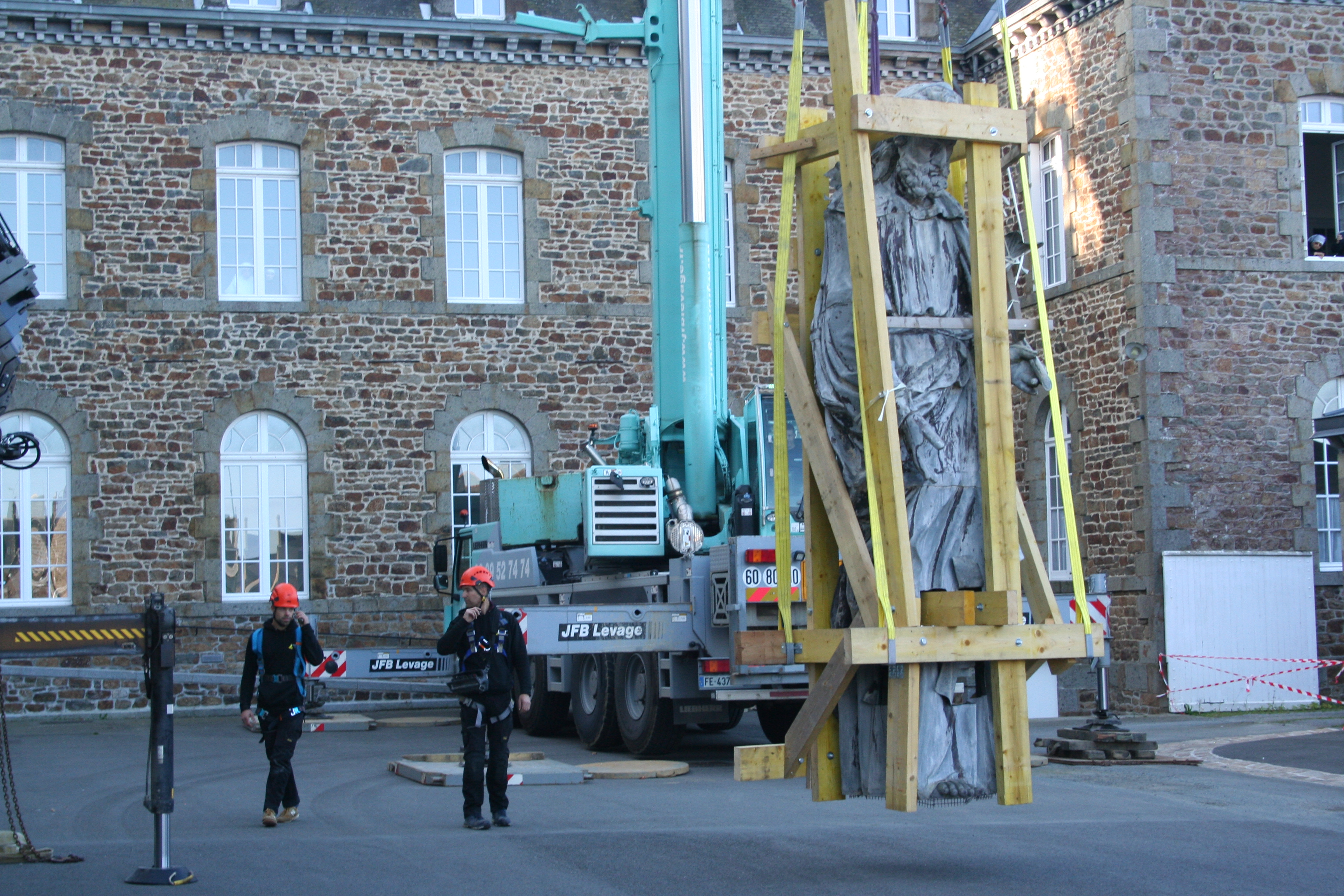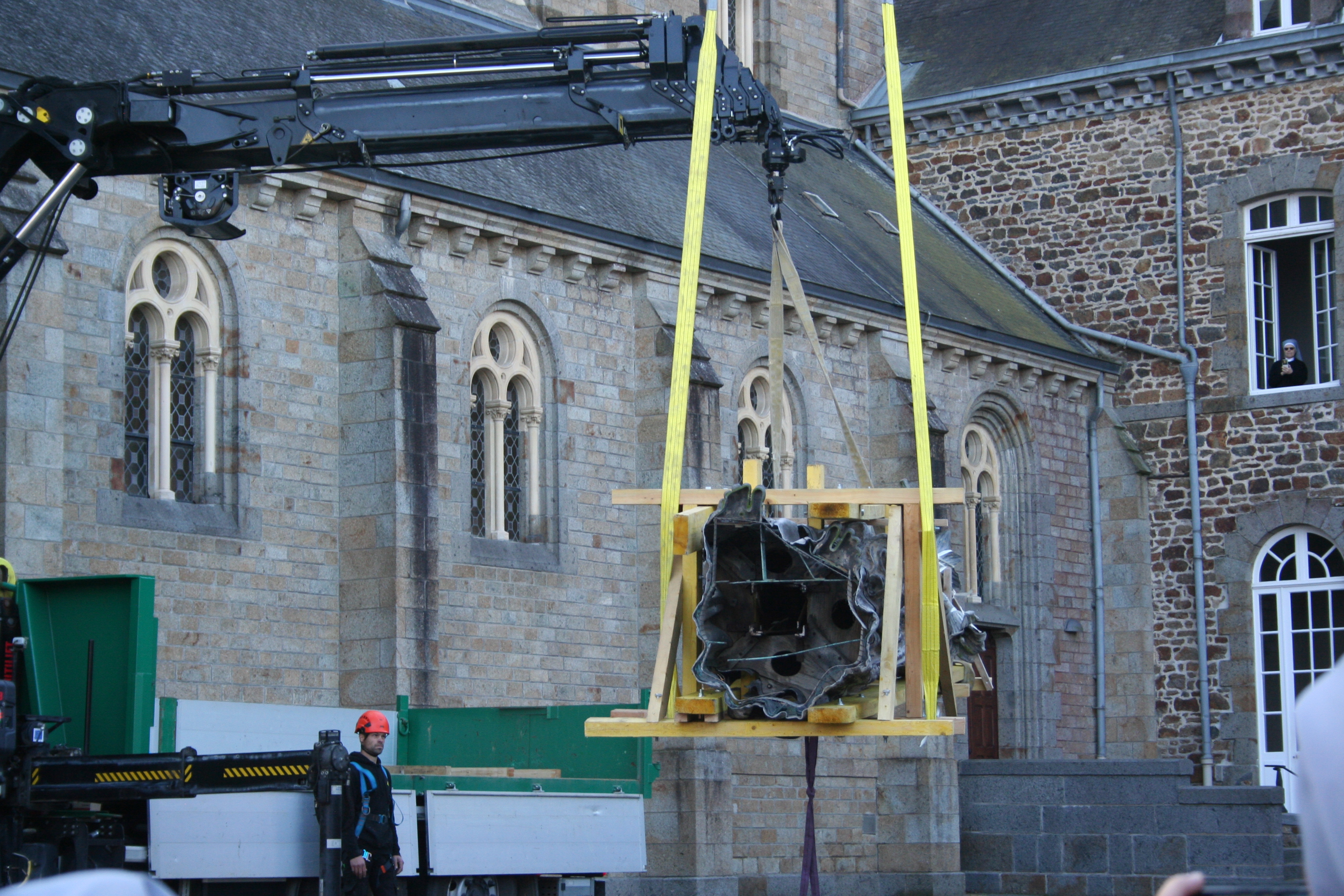 Ce matin, la statue de Saint Joseph, installée au sommet de la tour de la Maison Mère des Petites Sœurs des Pauvres à Saint-Pern, a été descendue à l’aide d’une grande grue. Les Petites Sœurs, les salariés et plusieurs habitants du quartier s’étaient donné rendez-vous pour assister à cette descente impressionnante. La statue est ensuite partie en direction d’Angers pour être restaurée.