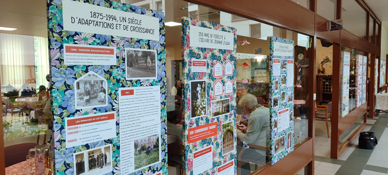 Dès l’entrée de la maison, une banderole annonce la fête. Des panneaux d’information et des photos des résidents d’autrefois et d’aujourd’hui décorent les couloirs.