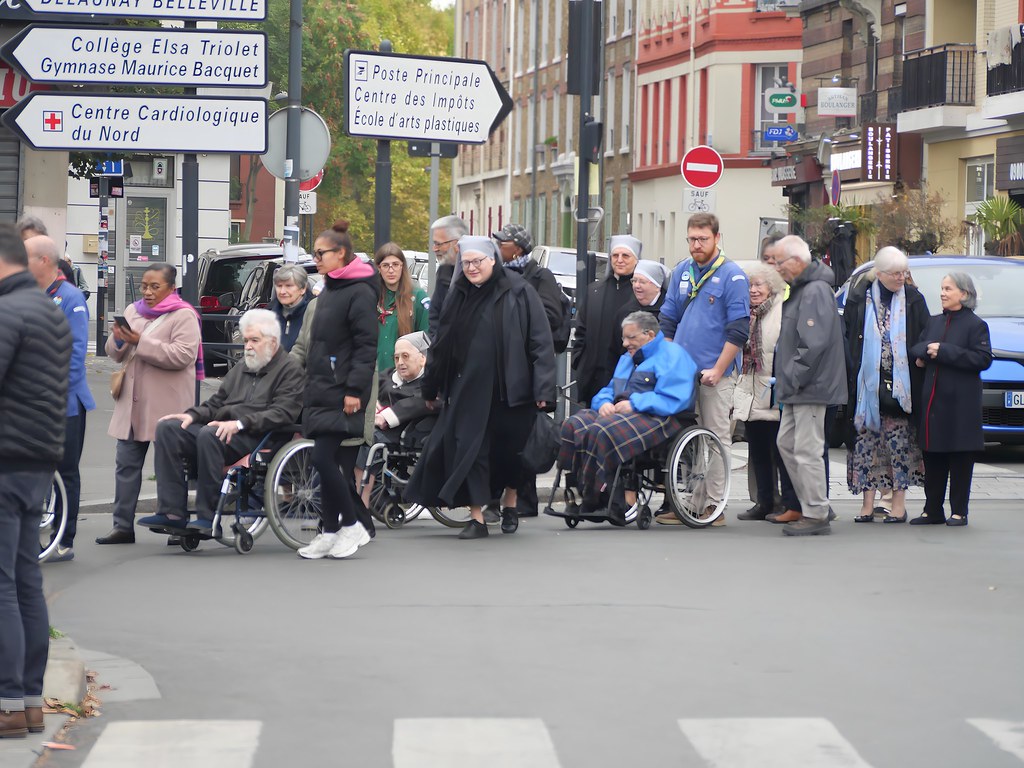 Dimanche 19 octobre 2025, la grande semaine de festivités s’est achevée par la messe télévisée sur CNEWS, célébrée à l’église Saint-Denys de l’Estrée. Vers 10 h, nous nous sommes mis en route, suivant la bannière de sainte Jeanne Jugan depuis la maison jusqu’à l’église, escortés par la police. Ce fut une joyeuse procession d’une trentaine de personnes, dont une dizaine en fauteuil roulant poussés par des scouts venus nous aider pour l’occasion. Les autres personnes âgées ont pu suivre la messe à la télévision.